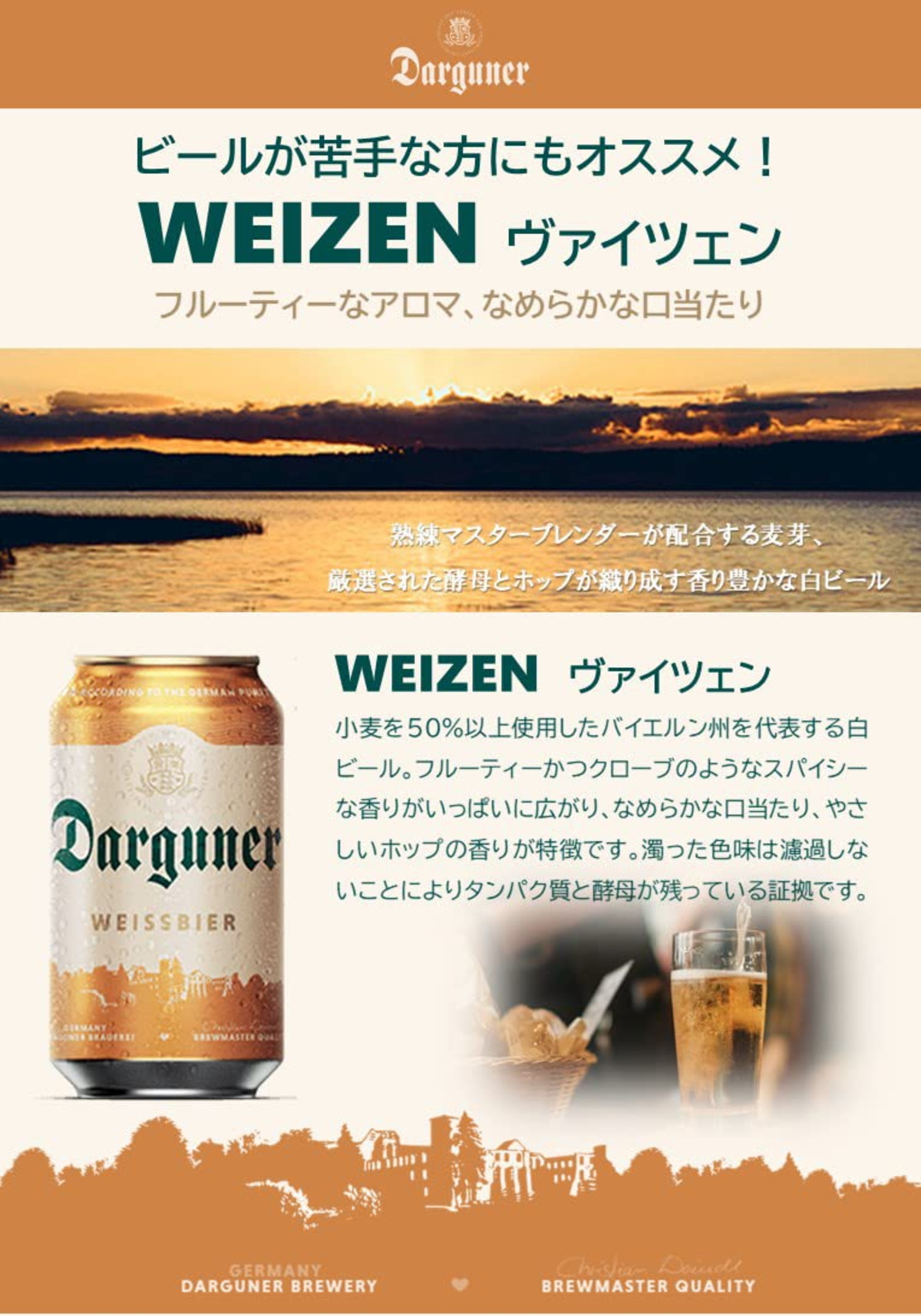 DARGUNER WEIZEN / ダルグナー ヴァイツェン小麦を50%以上使用したバイエルン州を代表する白ビールです。フルーティーかつクローブのようなスパイシーな香りがいっぱいに広がり、なめらかな口当たり、やさしいホップの香りが特徴です。濁った色味は濾過しないことによりタンパク質と酵母が残っている証拠です。*お飲みになる際には、まず中身の2/3をグラスに注ぎ、残り1/3は缶を優しく振って底に溜まった酵母をよく混ぜてから静かにグラスに注いでお召し上がりください。原産国 / ドイツアルコール度数 / 5%